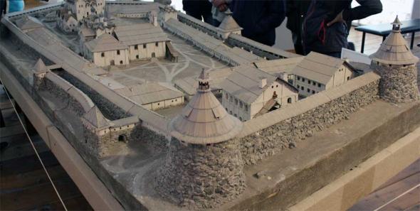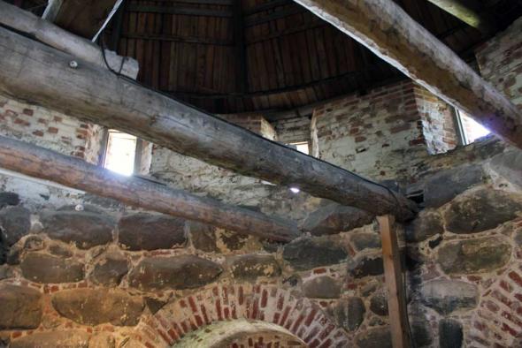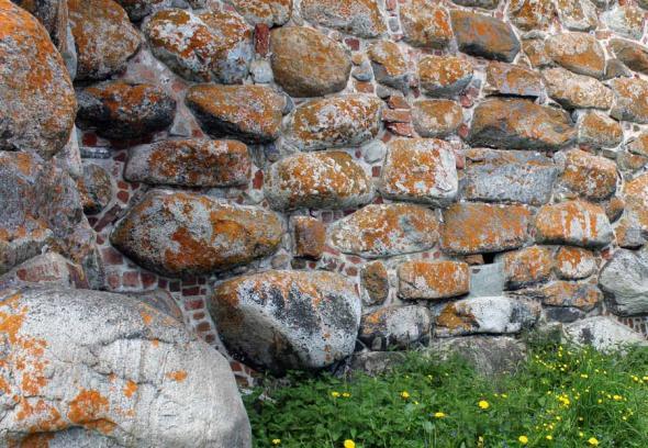 Массив стен покоится на сплошном фундаменте, выложенном из валунов и имеющем глубину до двух с половиной метров. Высота наземной части стен колеблется на разных участках от 8 до 11 метров. Толщина кладки у подошвы достигает 6, а в верхней части (по крепостному ходу) — 3—4 метров. Стена целиком выложена из громадных валунных блоков, залитых известковым раствором. Встречаются валуны, имеющее в поперечнике до полутора метров; вес таких камней достигает 6—7 тонн (есть даже указания, что отдельные камни весят до 700 пудов — около 11 тонн). Камень что перекрывает сверху арку Святых ворот имеет длину больше 5 метров, камень-карниз над входом на 2-й ярус Архангельской башни имеет длину около 4 метров. Валунные блоки плотно прилегают один к другому, делая поверхность стен чрезвычайно живописной. Оставшиеся при кладке пустые пространства между блоками закладывались небольшими камнями или кирпичом.